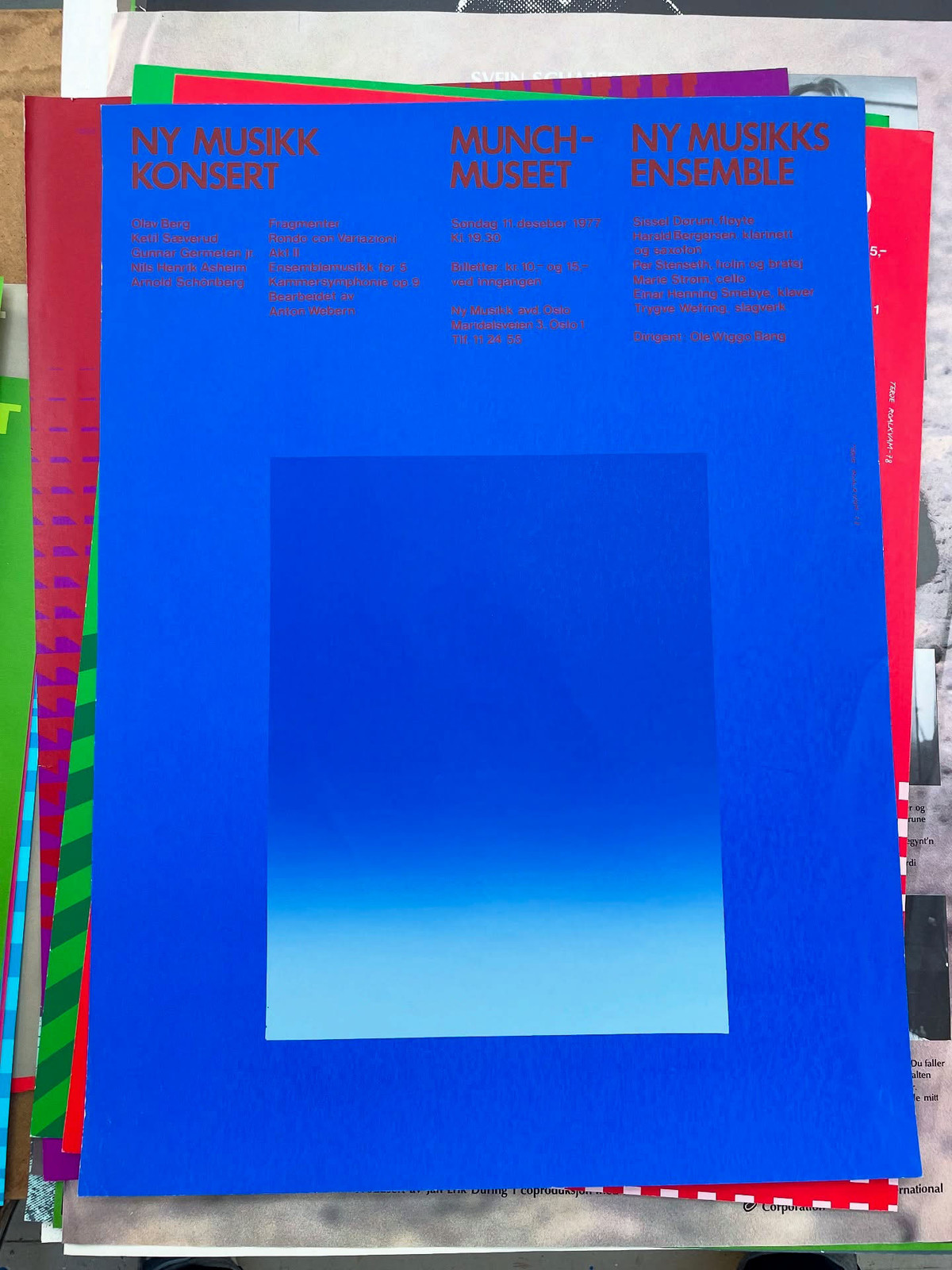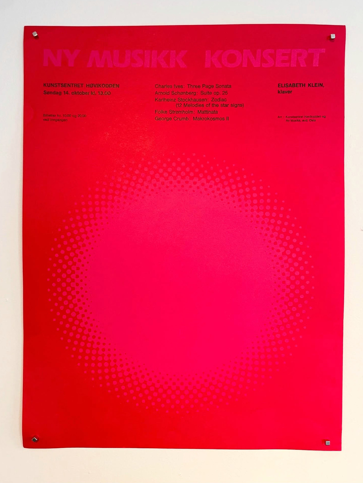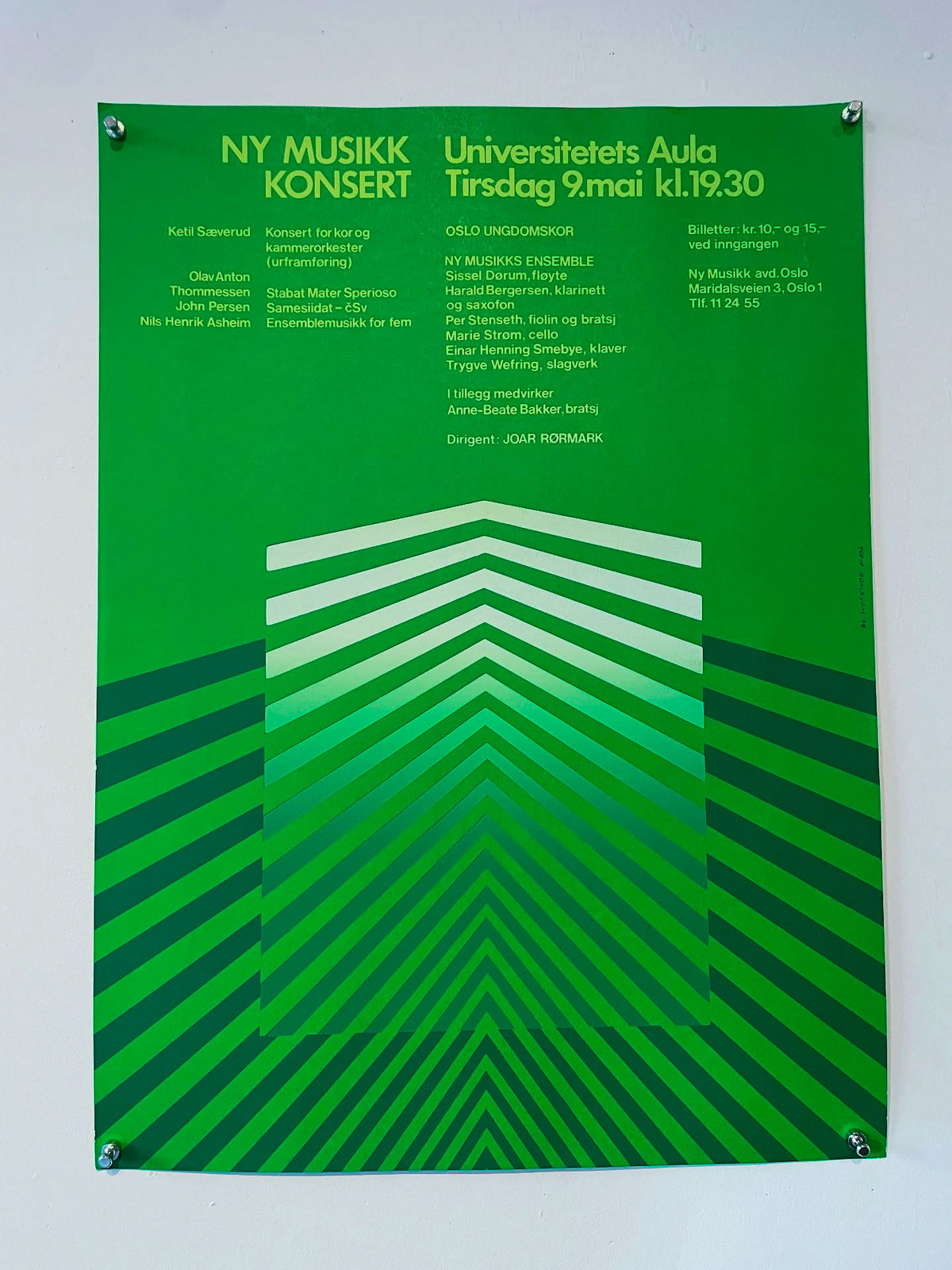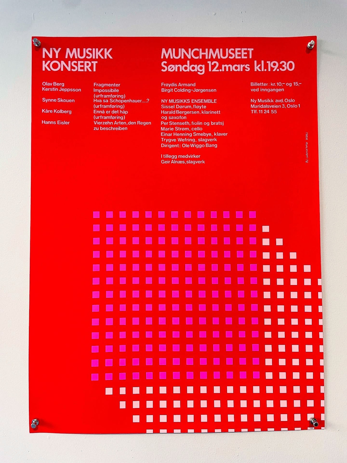 During the same years, Roalkvam designed a series of concert posters for Ny Musikk, establishing a strong visual profile for the association. These posters, produced between 1980-81, were created using silkscreen printing—a time-consuming process where each colour required a separate stencil and individual application. The stencils themselves were cut-and-paste works, common practice in the late 1970s. The coloured geometric designs were printed centrally and distributed to local Ny Musikk departments around the country, which then added concert information in black according to Roalkvam’s instructions.