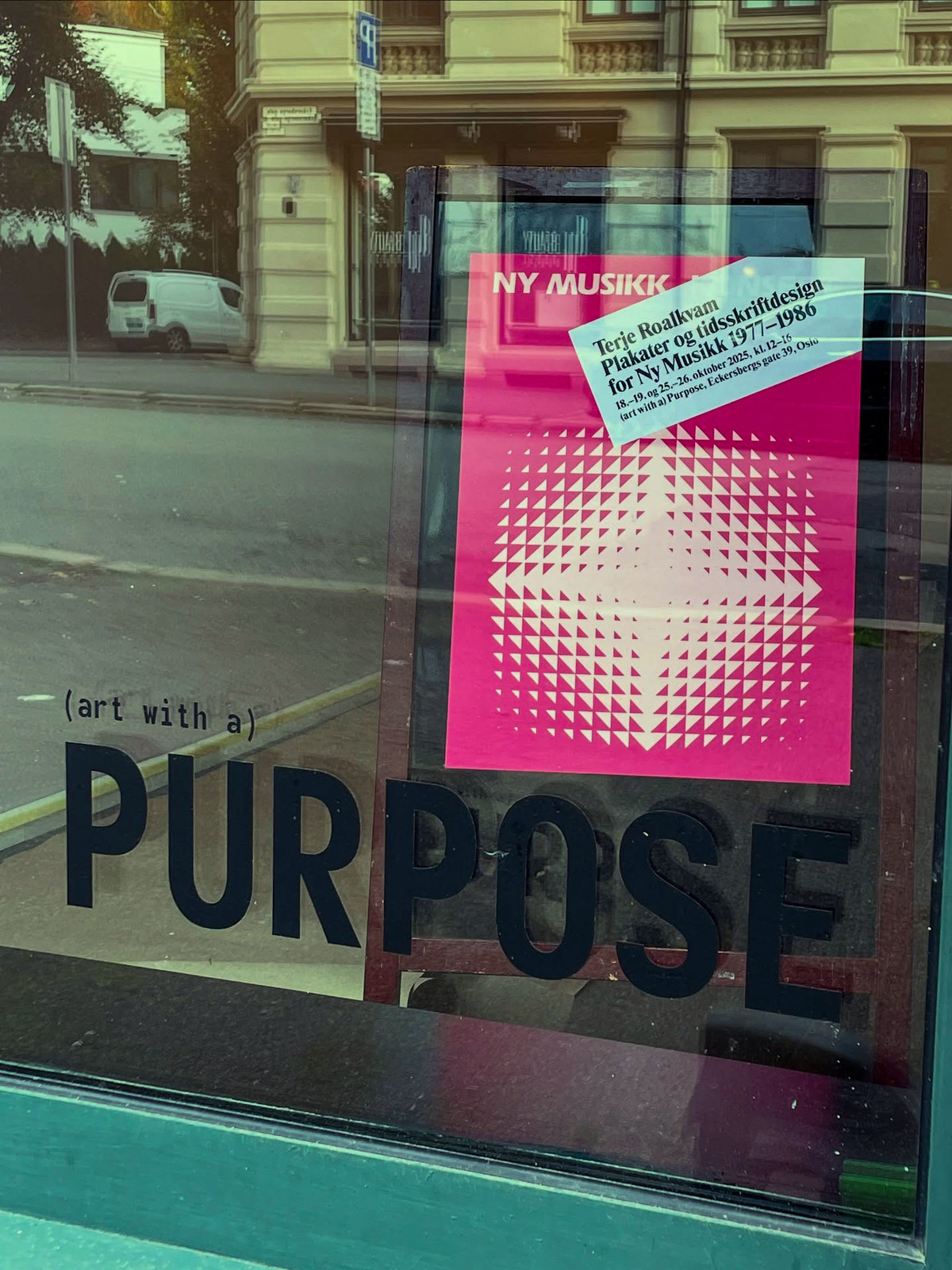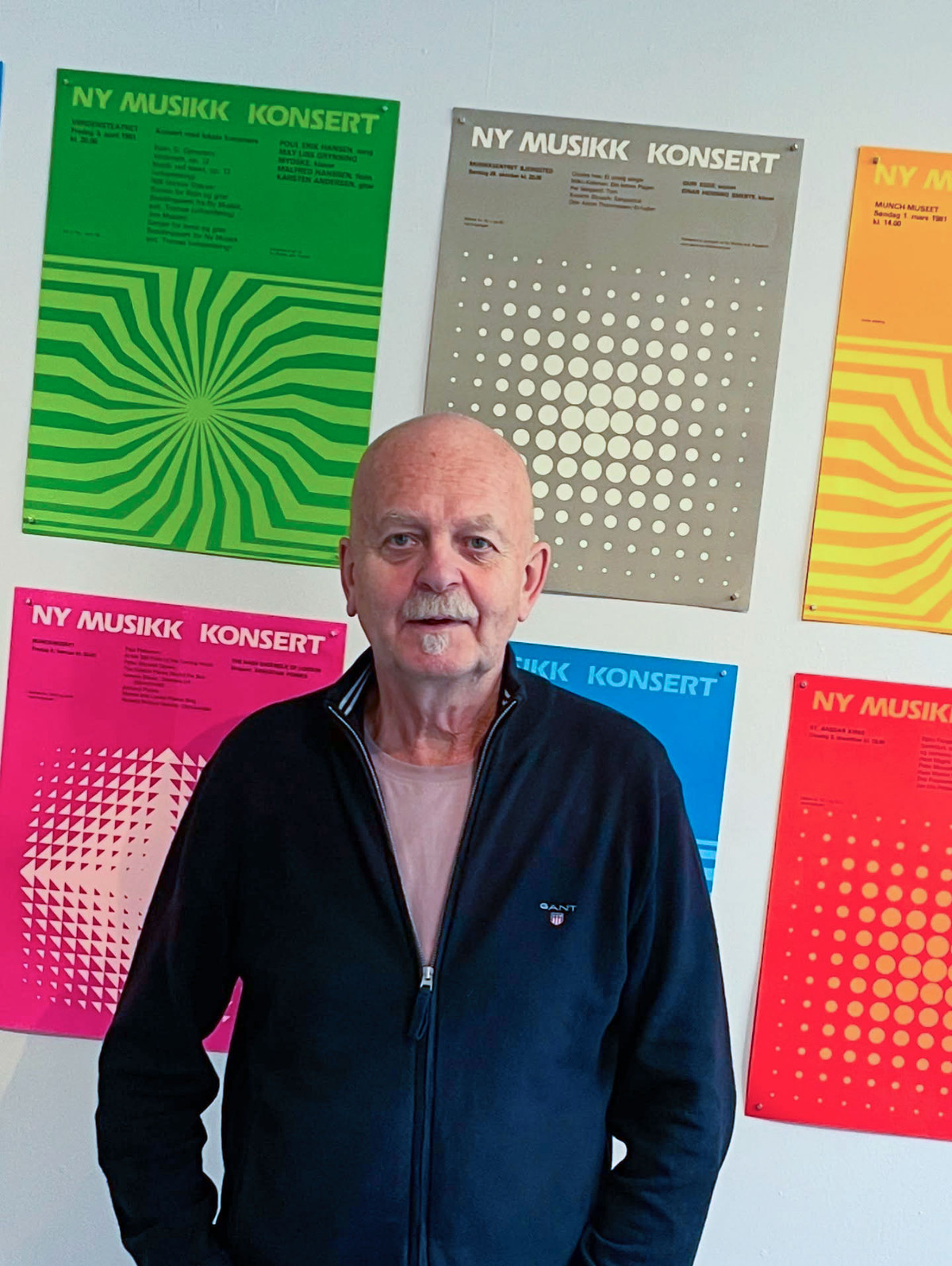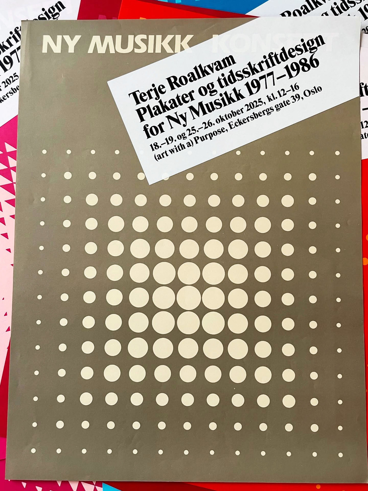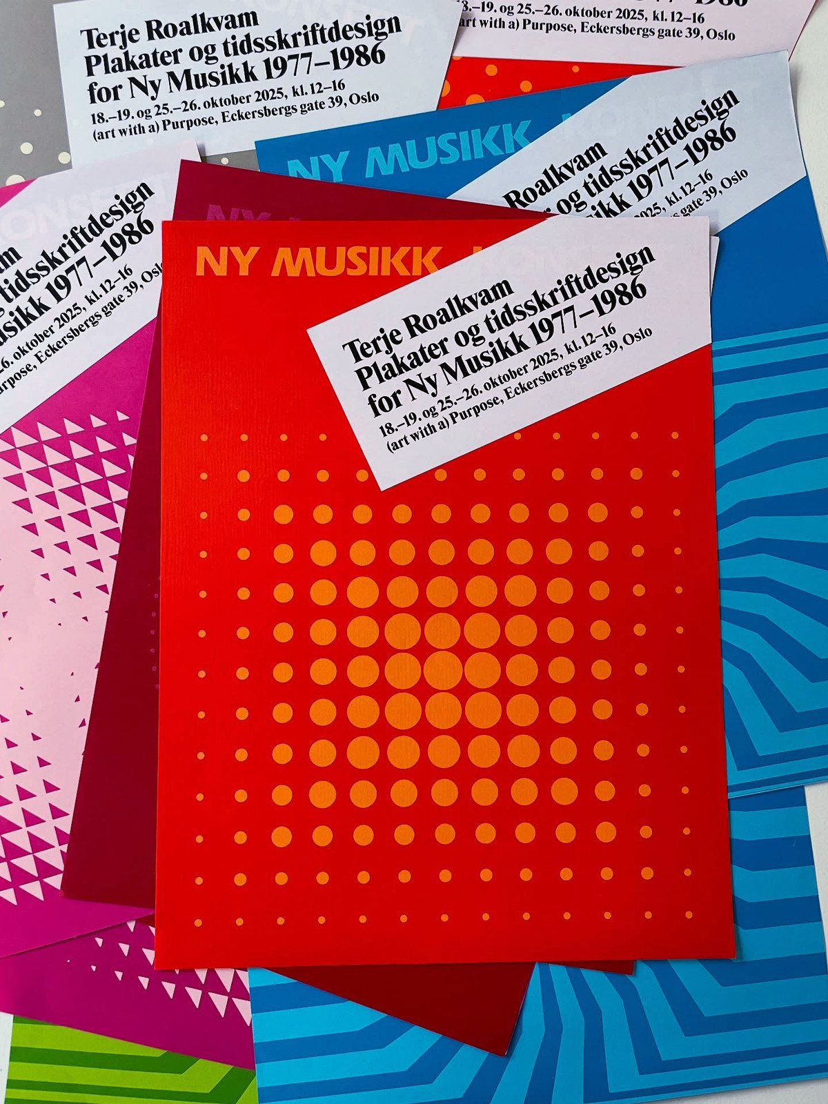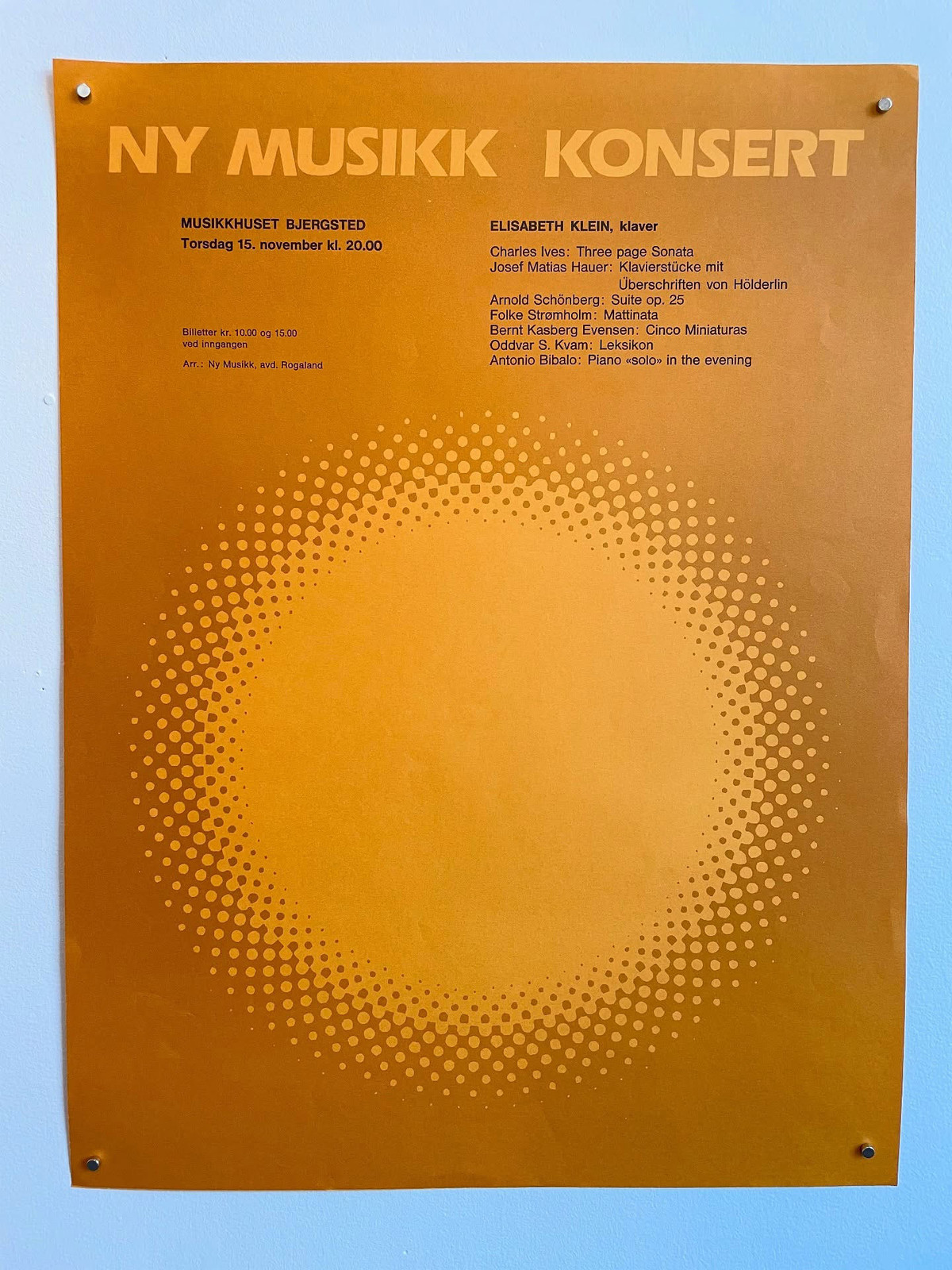 During the same years, Roalkvam designed a series of concert posters for Ny Musikk, establishing a strong visual profile for the association. These posters, produced between 1980-81, were created using silkscreen printing—a time-consuming process where each colour required a separate stencil and individual application. The stencils themselves were cut-and-paste works, common practice in the late 1970s. The coloured geometric designs were printed centrally and distributed to local Ny Musikk departments around the country, which then added concert information in black according to Roalkvam’s instructions.